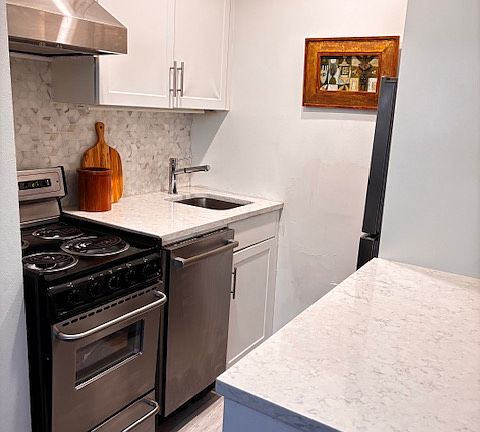 The kitchen was renovated with custom cabinetry and quartz counters. It has all the cookware, dinnerware, linens, etc. to host a dinner party for 8. Its efficient layout includes a dishwasher and clothing washer. It is open to the living area.
