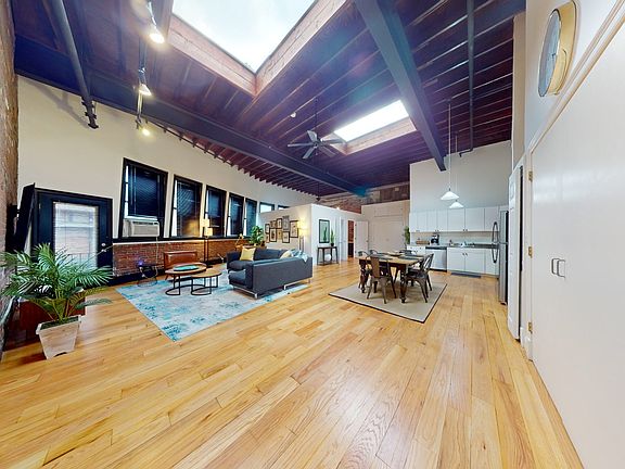 Open loftExposed brickFully equipped kitchenDining areaHardwood floorsQueen-sized bedsDedicated office area