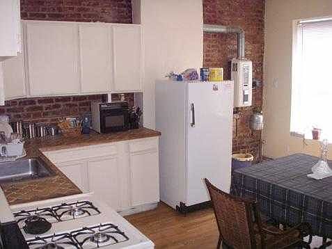 Modern bathModern kitchenExposed brickHardwood floorsHigh ceiling