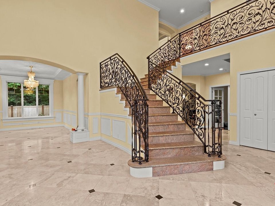 Enter through a dramatic foyer featuring marble flooring, a sweeping wrought iron staircase, and sparkling crystal chandeliers. Rich marble and cherrywood hardwoods add warmth and sophistication across the main living spaces.