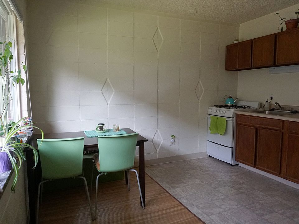 Gas rangeInterior carpeted storage closetGarbage disposalRoomy kitchenLots of closet spaceCarpet and vinyl flooring