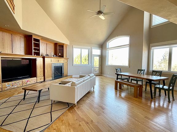 The home features a spacious open floor plan with soaring ceilings and an abundance of natural light. The kitchen is fully equipped.