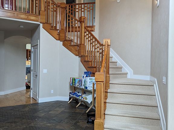 Upstairs has 4 bedrooms and 3 full bathrooms, with belcony looking over living space and entryway.
