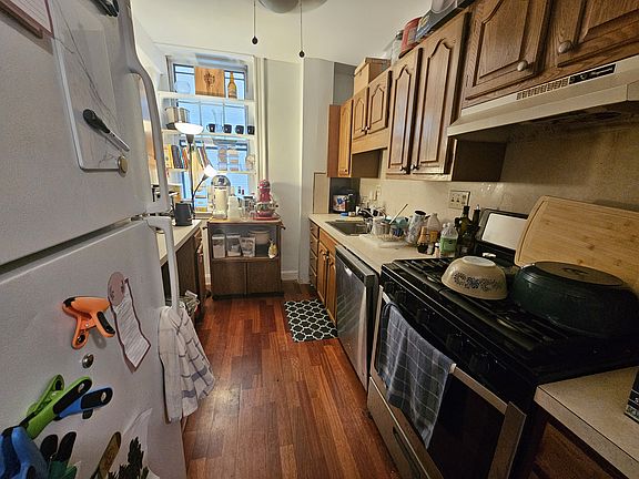 Inside, you'll find a fully equipped galley kitchen, gleaming hardwood floors, ceiling fans, and generous living space. Heat and hot water are included in the rent for added value and convenience. Laundry facilities are available in the building, and pets are negotiable.