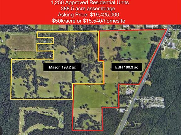 1,250 unit single family residential development opportunity. Approved for a mix of 40 ft and 50 ft wide single family homesites and 70 ft villa homesites. All necessary utilities available. Fronting 1/2 mile along Broad St. just south of Brooksville across from Southern Hills. Recent boundary survey, Geotechnical Reports, Phase 1 Environmental Assessments completed. Beautiful rolling pasture land with large scattered oaks enjoys