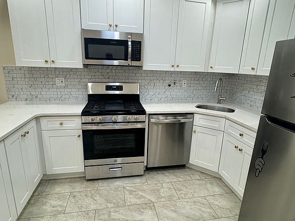 The apartment has been fully renovated and features a modern kitchen with white shaker cabinets, quartz countertops, mosaic backsplash, and stainless-steel appliances including a microwave and dishwasher. You'll also love the beautifully updated bathroom with full wall tile, a mosaic accent, marble-style floors, and a clean tub/shower combo.