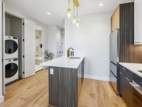 The chef-style kitchen boasts high-end stainless steel appliances, quartz countertops, and a sleek island perfect for entertaining or casual meals. Both bedrooms are spacious and bright, offering comfort and flexibility for any lifestyle.