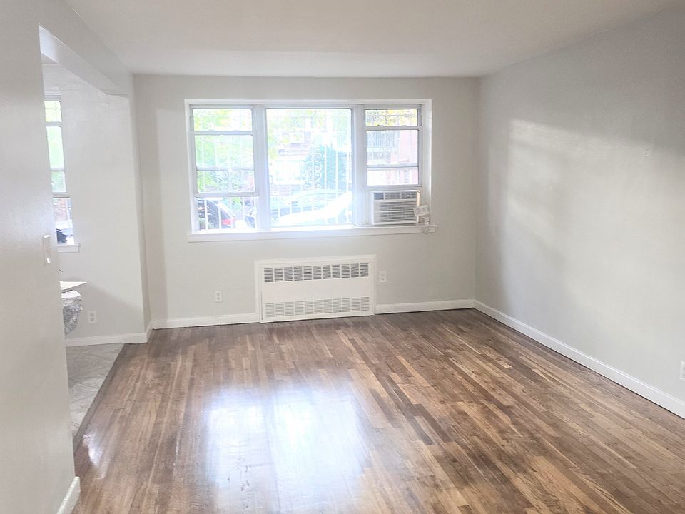 The apartment has been freshly painted throughout, and the floors were redone giving a warm and modern feel. The kitchen features a brand new refrigerator, ample storage space, and multiple pantry closets. You'll also enjoy a dining room, air conditioning in the living room, and thoughtful storage with a linen closet and coat closet.