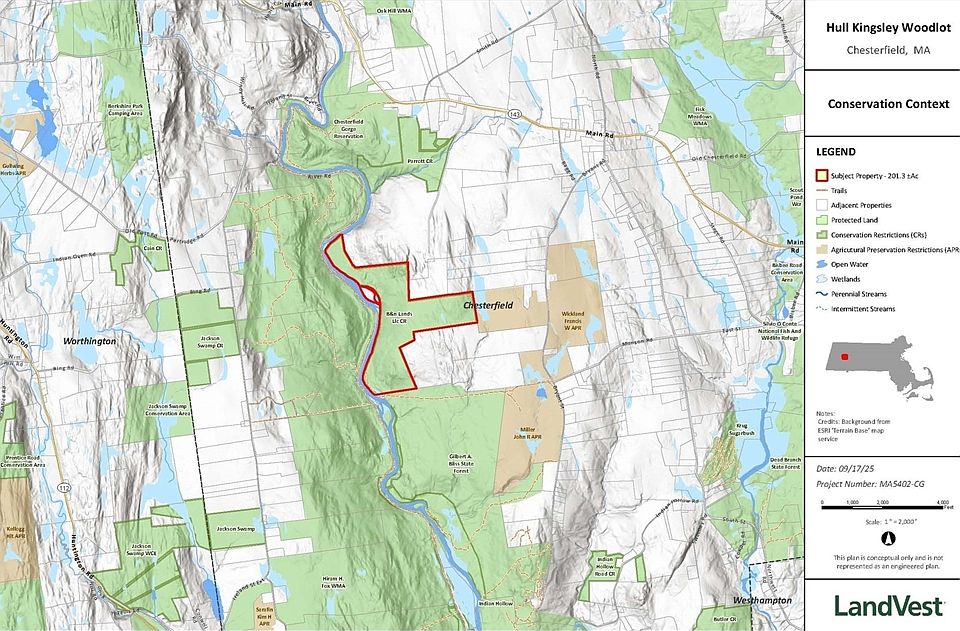 The Kingsley Lot is 201.3 acres of forest land with 6,760 feet of frontage along the federally designated Wild and Scenic Westfield River in Chesterfield , MA. There is an island in the river that is a part of this property. The property is subject to a permanent Conservation Restriction held by the Mass Div Conservation and Recreation, formerly DEM, that prohibits development and has harvesting restrictions along the river and allows public access. The property has been managed by a professional forester for many years and supports a forest of red oak, red maple, birch, white pine and hemlock. A recent timber inventory in the documents section, identified a total value of $130,000 Property is classified under Chapter 61 for reduced property assessment. The CR is located at Book 5971 Page 110. Set along the Westfield River—the first in Massachusetts designated Wild and Scenic—these parcels offer a rare chance to own a piece of unspoiled New England beauty.