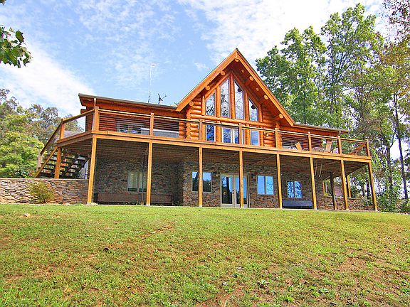 This custom log home is situated on approximately 40 acres in the Ozark Foothills, near Marble Hill, MO. The property is the perfect paradise for those who love privacy and the outdoors. This is a true log home, built with 12+ inch, sustainably harvested, pine and spruce logs. All of the wood flooring and trim in the home was locally grown and processed. Built in 2004, the 4000 square foot home was designed for the site, so that every bedroom and common area has a lake view. As you walk in the grand foyer, you are greeted with a log stairway to the loft. Upon entering the great room, you will be welcomed by the open concept living areas, framed by incredible views of the lake, and the large stone fireplace. The kitchen features custom cabinets, granite counter tops, large center island, Jenn-Air gas range, and large pantry. The combined dining room, living room and kitchen areas provide a perfect space for entertaining. The main level has access to the large deck expanding the length of the rear of the home, overlooking the lake. With 5 bedrooms, 3 baths and loft, there is ample room for the family, and guests. On the main level, the Master bedroom has access to the deck. The bath features a jetted soaking tub and large tile shower with dual shower heads. The master bath has access to the large walk-in closet, which also connects to the laundry room. The second bedroom and bath are also on the main level. On the lower level you will find two more bedrooms, one with en-suite bath. This could be a mother-in-law suite or provide room for guests. The lower level also features a large family room, with wet bar, and walks out to a large patio overlooking the lake. A large storage and utility room features ample built-in shelving. Finally, there is a bonus room on the lower level that could be used as an office, gym, media center, or additional storage. The loft features a sitting area that overlooks the great room, and a phenomenal lake view. There is also a large area that can be used as guest quarters, a bunk room, an office or a den. The exterior of the home features: ~40 acres Over sized two car garage 30x40 shop with HVAC 4 acre stocked lake with gazebo for fishing, swimming, relaxing Established ATV trails into the woods Mostly wooded land perfect for hunting Wildlife including deer, eagles, turkeys, and more! Professionally installed low maintenance landscaping around home. Additional acreage available. This home is currently serving as a 5-star vacation rental, providing an excellent investment opportunity. The home could also serve as a retreat, hunting lodge, or other revenue-generating property. All of this can be yours for $499,000. Contact Beverly Peters