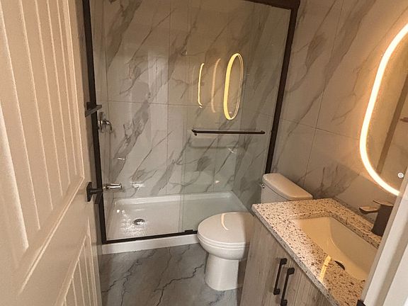 Full walls & and floor tiles. Sleek & modern design