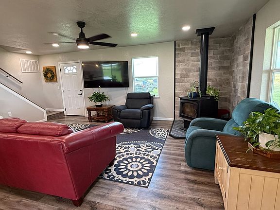 The open living area is spacious and anchored by a wood-burning stove, offering a great source of supplemental heat during the winter months.