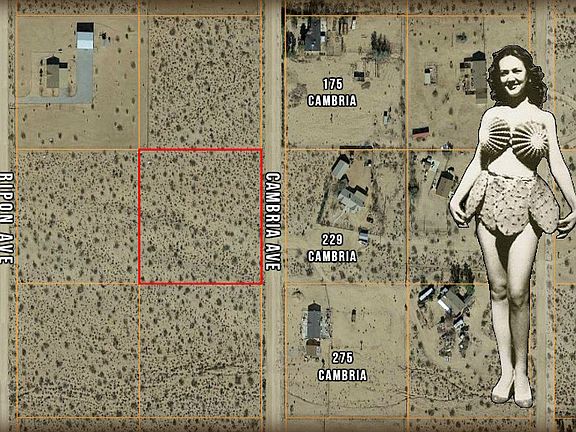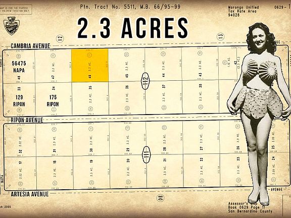 First of two parcels on this neighborhood block in Flamingo Heights. This quiet desert neighborhood is family oriented with each home occupying about 2.5 acres. That gives everyone enough breathing room. We are told by Bighorn Desert View Water that there is water along the street to tap into (meter cost @ $6500, please verify with Bighorn Desert View 760-364-2315) Easy access to town and local schools. Perfect building parcel. To purchase this property on terms from DesertLand, we require a Down Payment of $3000 and a Flat Rate Escrow Fee of $492. So your total start-up cost for the property on Cambria Avenue 001 is $3492. You can then choose a loan that best fits your budget: 5-year loan ($247 a month), 10-year loan ($149 a month), or a 15-year loan ($119 a month). We conduct a traditional escrow with title insurance. We do not require a credit check. Do not have the down payment? Look into our Down Payment Program. On that program, it is only $341 to start owning this land on Cambria Avenue today.