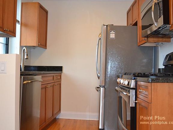 Eat-in galley kitchenHardwood floorsMarble tiled bathroomGranite countertopsAmple closet spaceStainless steel appliancesLarge bedrooms