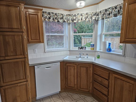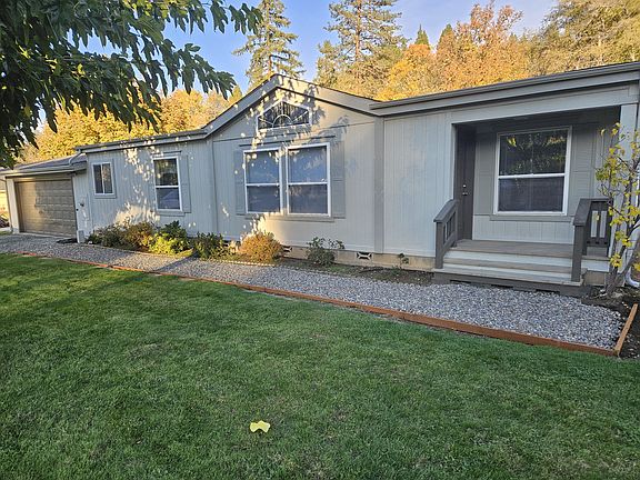 Beautiful vaulted ceilings with great light, new vinyl flooring and carpet in bedrooms, new blinds and valances for the windows, replaced windows and new window installed in master bath, new shower in master bath to finish with a shower door, freshly painted entire interior and exterior, owner pays to have exterior bug sprayed monthly, new front deck to enter the dwelling, back yard fenced, and new deck to view Canyon Creek and also ability to walk to the creek, walking distance to Seven Feathers Casino on new side walks just installed in Canyonville. Very Clean!