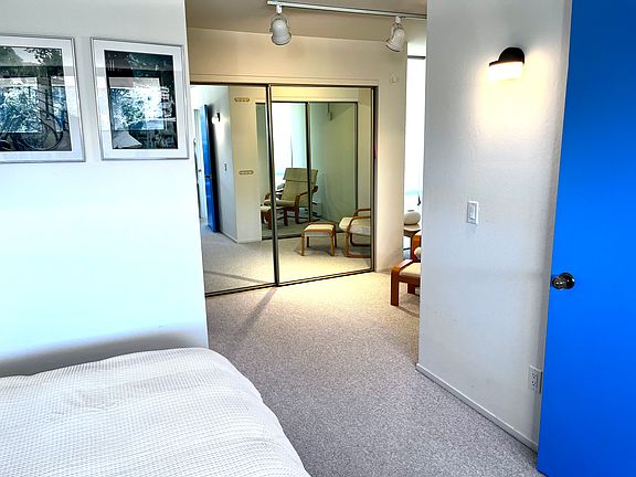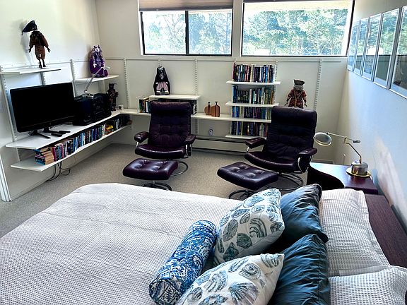 The living area boasts plush, contemporary seating, elegant glass-top tables, and a curated collection of artwork, creating a refined yet inviting atmosphere. Large windows bring in ample sunlight, enhancing the airy feel of the space. The space is perfect for artists looking for their muse, but is also close to Carmel, making it ideal for relaxing or entertaining guests.