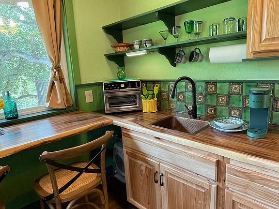 Copper sink in kitchenette. Mexican tile in kitchen and bath.