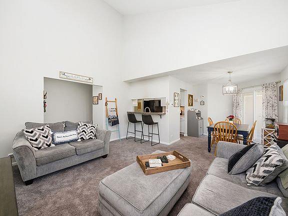 Beautifully updated end-unit ranch townhome offering easy, single-level living. This 2-bedroom, 1.1 bath home features a bright and inviting living room with vaulted ceilings, creating an open and airy feel. Enjoy a separate dining area perfect for everyday meals or entertaining. The updated kitchen includes a breakfast bar, ample 42 inch cabinetry, and modern finishes. The primary bedroom offers a private en-suite full bath and a generous walk-in closet. The spacious 2nd bedroom has great closet space. Utility room with full sized washer and dryer is conveniently located off the attached one-car garage with plenty of storage. There is also ample guest parking. A private patio surrounded by green space completes the package. Rentals are allowed. Newer carpeting and flooring, HVAC (2021), HWH (2022). Thoughtfully maintained and move-in ready, this home is an ideal blend of comfort, convenience and style.