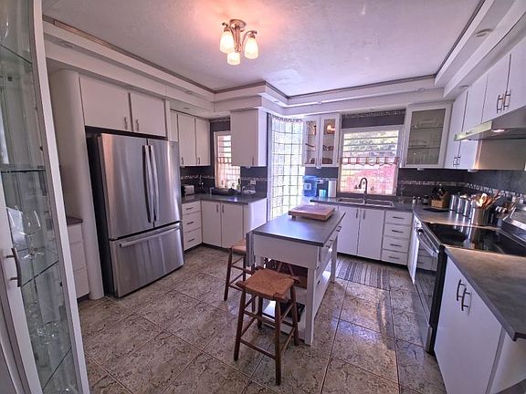 - Modern kitchen with island, high-quality cabinets, stove, and refrigerator