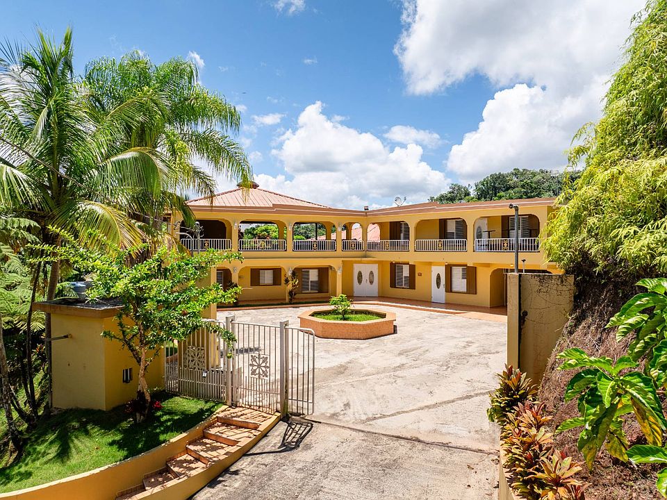 Set on a lush hillside in the mountains of Lares, Puerto Rico, this spacious property offers a unique layout and endless possibilities for customization. With 8 bedrooms, 6 full bathrooms, and 2 half baths spread across two levels, it provides generous space for residential or rental use. The interior features high vaulted ceilings with wood accents, an open living area, and a functional kitchen, while the exterior includes scenic mountain views, a wraparound balcony, and a rustic wooden structure known as "La Tiendita de Don Cando." Whether you're seeking a peaceful residence, a guesthouse investment, or a private retreat surrounded by nature, this hidden gem in Lares delivers endless possibilities.