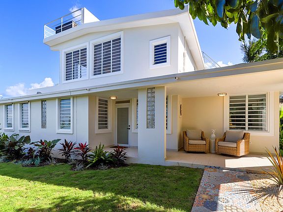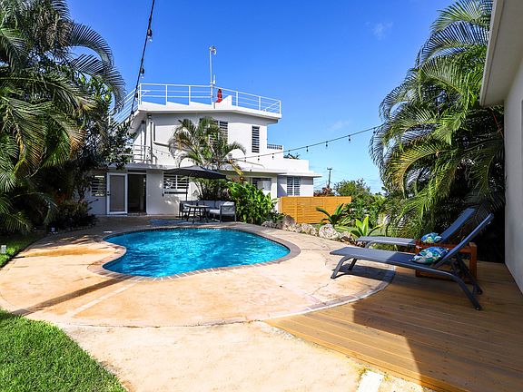 Casa Vista Linda is located on an exclusive quiet street in Puntas, just a two-minute walk to Sandy Beach. This four-bedroom three-bathroom home with ocean views has a chic bohemian feel and luxury finishes throughout. This home is move-in ready, complete with tile floors, up-to-date bathrooms, and a large kitchen featuring stainless appliances, wood cabinetry, and granite countertops. Usher in the ocean breeze and natural light through the home's many windows while surrounded by lush landscaping creating privacy and the perfect island escape. The completely fenced-in property features an electric gate and plenty of outdoor living space, including multiple outdoor decks and a spacious grassy area perfect for growing your garden or building a beautiful outdoor gazebo. One of the highlights of Casa Vista Linda is the spacious private master floor. Separated from the rest of the house and with a private entrance, the master suite features an office space and sitting area with doors leading out to a private balcony. End your day by using the master suite's outdoor shower and taking in the expansive views. Above the master, you will find a rooftop deck complete with solar panels and beautiful mosaic tiles. The rooftop deck is the highest point of the home and offers breathtaking far-reaching views overlooking the ocean and Aguadilla. This is the perfect place for relaxing in the evening, star-gazing, and seeing the city lights. Casa Vista Linda offers many options for a potential buyer. A private entrance to the master bedroom and rooftop deck creates an opportunity for a luxury rental unit. Behind the pool, you will find a large storage structure suitable to add a second floor ready to become your guest house or two additional rental units. Enjoy all of what this home in one of the best locations in Rincon has to offer by making it your ideal family getaway or the perfect profit-producing multi-unit luxury Rincon rental.
