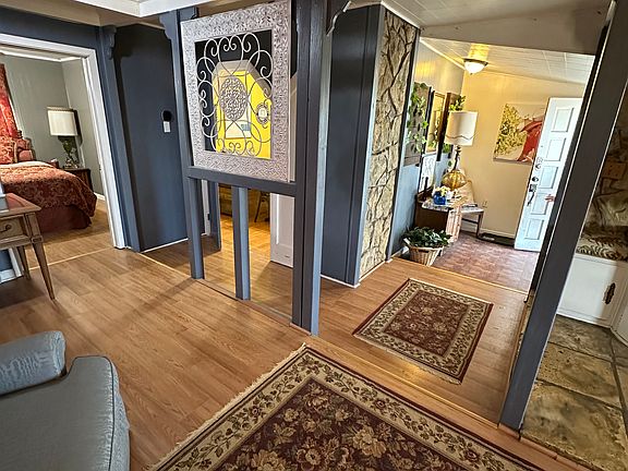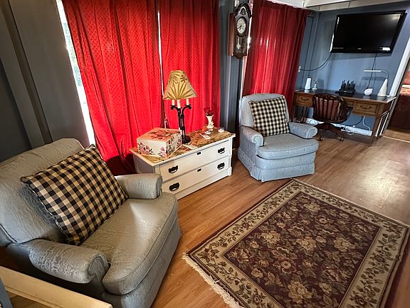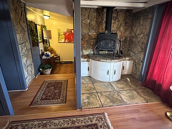 Inside, you'll find a warm and inviting space featuring a spacious kitchen with all-electric appliances, pantry, microwave, garbage disposal, coffee maker, and a full-size stove/oven. The dining area flows into a comfortable family room complete with a wood stove for winter ambiance, a TV, cozy seating, and a dedicated desk workstation perfect for remote work or creative projects.