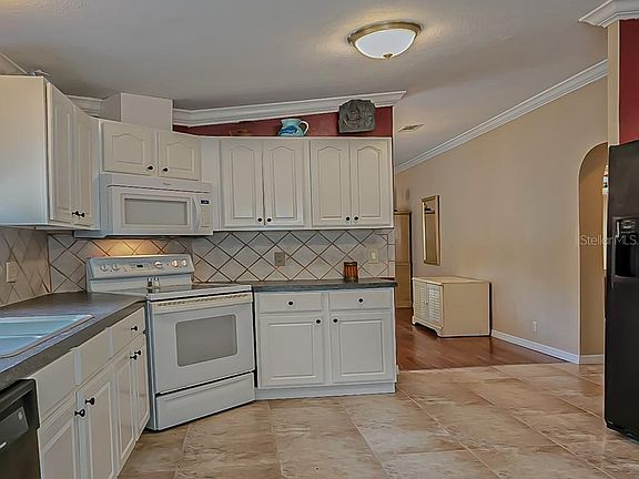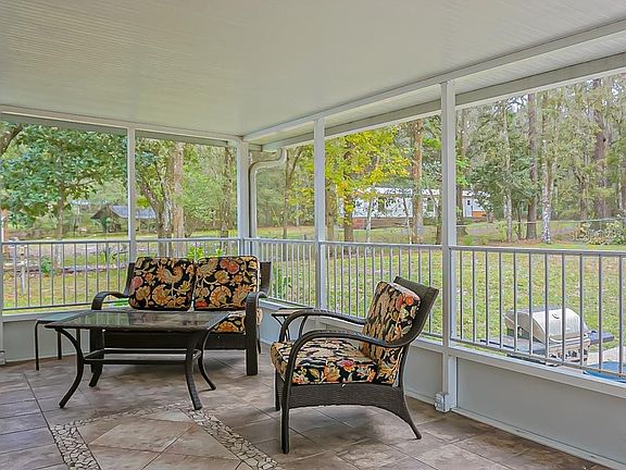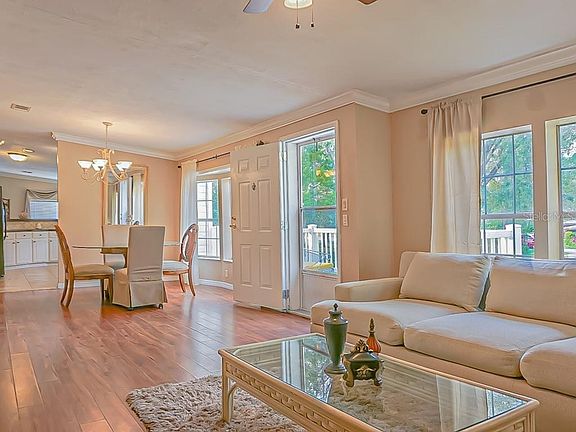 UPGRADED manufactured home on fenced 2/3 acre. Great Curb appeal with spacious front Deck to welcome you. Once inside, notice the striking Wood Laminate floors, Crown molding and chair rail, stunning interior paint and decor, large bedrooms in this split bedroom plan with Master suite and family room on one end of the home while Formal living and dining rooms & secondary bedrooms & guest bath are on opposite end for privacy... PERFECT floorplan for extended family! Kitchen is the center hub of the home with wood cabinets, updated appliances, stone backsplash, eat-in dining space & breakfast highbar all OPEN to leisure room with wood-burning fireplace and access to Screened Lanai. Elegant Master Suite with crown molding, walk in closet and bath ensuite with soaking garden tub, separate shower and dual sinks in vanity. BRING all your TOYS to this huge detached metal RV garage with second bay, on concrete slab with electric and plenty of room to tinker or park a motorcycle, boat, trailer, RV or Antique car! Screened lanai is oversized with custom tile inlay floor and peaceful views of the fenced backyard. NO HOA or CDD fees or deed restrictions here...CALL TODAY and make it yours!