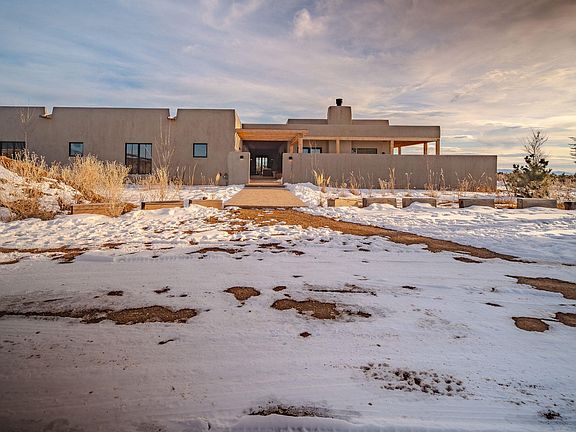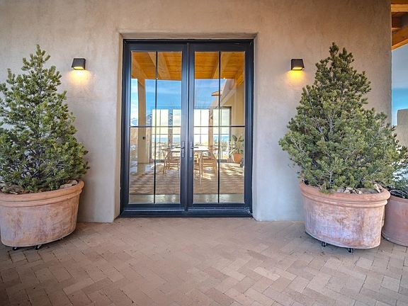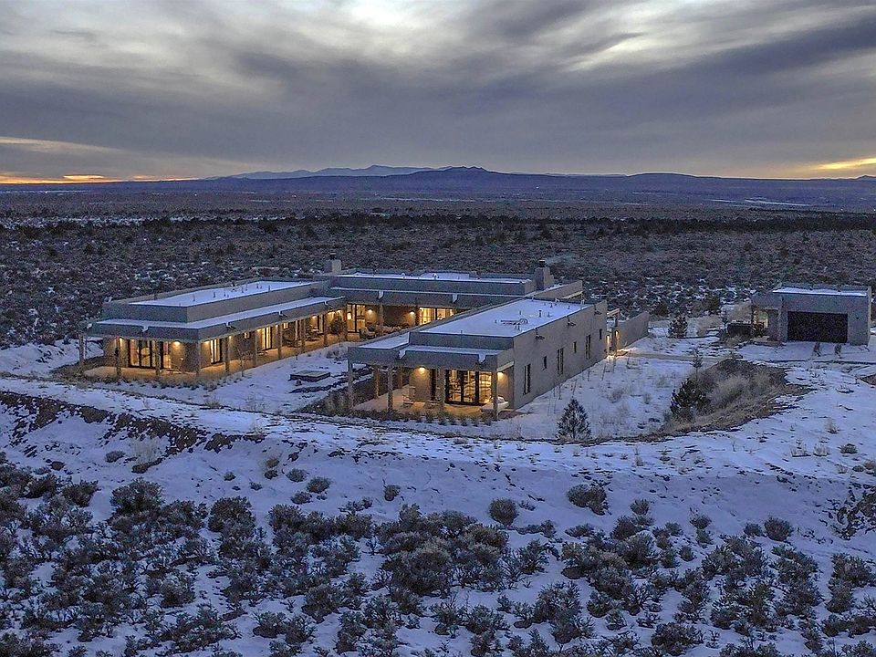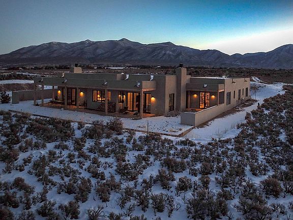 Completed in August 2024, this architecturally refined, modern-hacienda-style residence on Cavalry Camp Road offers a rare blend of contemporary design, thoughtful craftsmanship, and true indoor-outdoor living. Designed by Jed Magee of Magee Design, LLC and built by Aaron Magee of Magee Build, the property embodies exceptional attention to detail, materials, and long-term performance. The property is located in the highly desirable area of Arroyo Seco, with Taos Ski Valley just 20 minutes away, offering access to world-class skiing and year-round mountain recreation. Shopping, dining, and the Historic Taos Plaza are also conveniently close by, providing easy access to the cultural and culinary heart of Taos. The residence sits on 10 acres and borders Pueblo land, which provides additional privacy and long-term protection of the surrounding landscape and stunning views. The residence spans 4,492 square feet across a main residence and a fully independent guest residence, providing flexibility for hosting, multi-generational living, or creative use. The home’s purposeful siting frames dramatic views of the Sangre de Cristo Mountains to its east and reveals an unobstructed 180° sunset panorama to its west. The main residence (3,108 sq ft) features 2 bedrooms and 2 baths, while the guest residence (1,384 sq ft) offers 3 bedrooms and 2.5 baths, for a total of 5 bedrooms and 4.5 bathrooms (including one bedroom currently used as a library). Each part of the extended home is designed to open to the substantial 2,700+ sq ft courtyard of lavender, English roses, and native plants. Both the main house and the guest wing are fully self-sufficient with separate radiant heating systems, dedicated on-demand water heaters, laundry facilities, and mechanical rooms, ensuring comfort, efficiency, and privacy. Each room is equipped with individual smart thermostats, and a centralized smart home hub allows seamless control of lighting and heating throughout the property. Indoor spaces open gracefully to expansive exterior living areas, including a substantial 2,400 square feet of covered portals framing the central courtyard and multiple patios positioned to capture light, extraordinary views, and total privacy—hallmarks of the home’s modern hacienda design. A detached two-car garage completes the compound. Constructed with 6-inch ICF walls for superior insulation and durability, the residence features TPO roofing with copper-lined cedar canales, cottonwood-colored stucco, and Sierra Pacific clad windows and doors. Interior finishes include pigmented finish plaster walls, quartz countertops throughout, two fireplaces, and Zia handmade encaustic cement tile flooring. The primary and guest baths are accented with Zia handmade cotto tile, reinforcing the home’s refined Southwestern character. The kitchen is outfitted with a premium appliance suite, including Wolf, Sub-Zero, Monogram, and Bosch, complemented by multiple freezer units for convenience and storage. This newly completed residence offers a compelling combination of architectural integrity, craftsmanship, privacy, protected views, and lifestyle—ideal for those seeking a private courtyard compound in one of Arroyo Seco’s most desirable settings with convenient access to Taos Ski Valley and the very best of Taos.