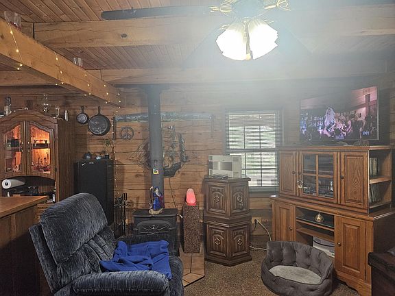 Rare find-5.75 ac M/L Oak log cabin with wrap-around porch-1 bedroom 1 bath and fully equipped kitchen. Dining/living room combo and washer dryer. 30x30 shop building Private and secluded surrounded by mature pines Only a few miles from the northfork river.On pavement.