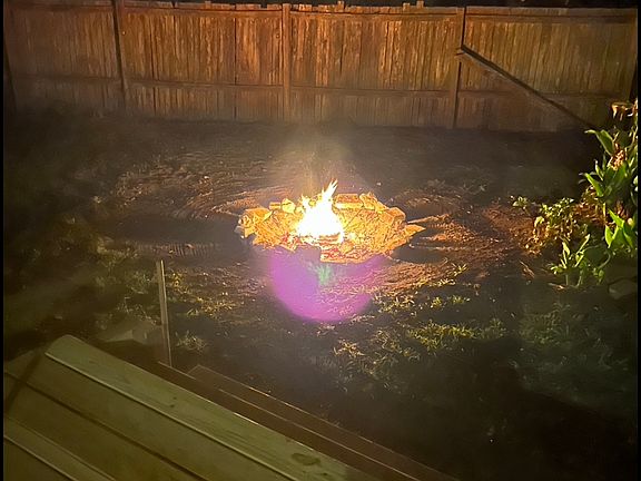 Exterior awning for outdoor shade and comfort with exterior tv, reclining lounge chairs and private fire pit!