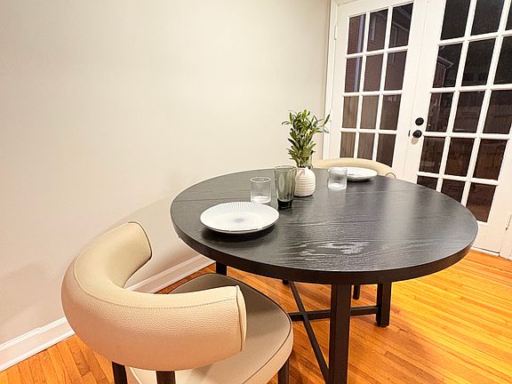 Open dining area with a modern round table and chairs, perfect for meals or working from home