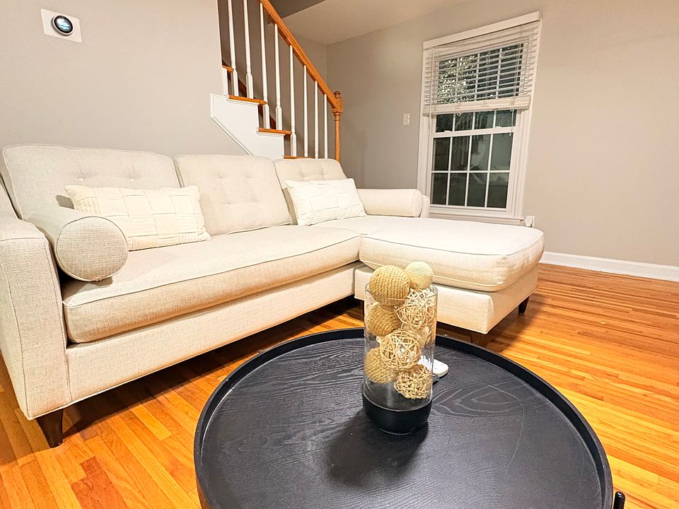 Cozy living room with a plush sectional sofa, smart TV, and stylish coffee table