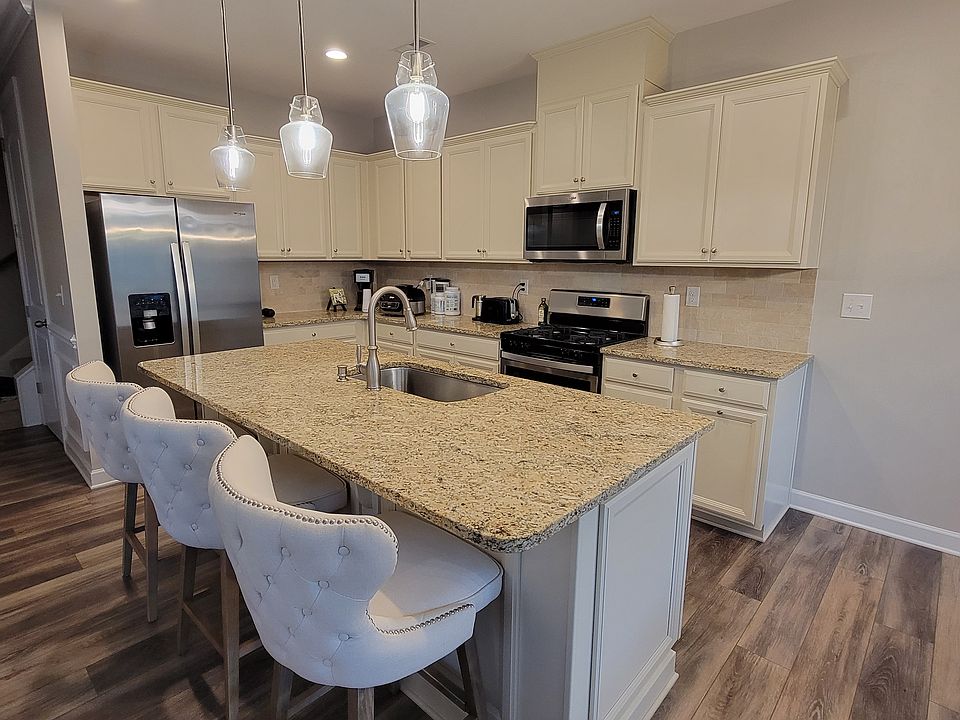 Welcome home to this immaculate 3 bedroom, 2.5 bathroom end-unit townhome with large 2 car garage in the popular community of Stonehaven at Berewick. Hardwood floors and wainscoting greet you and lead into an open floor plan. The kitchen is the heart of the home, featuring stainless steel appliances, gas range, an apron sink, tile backsplash, quartz countertops, and a breakfast bar along the large center island. The adjacent living room, made warm by a gas fireplace, provides direct access to a back patio. Unwind in the privacy of the primary bedroom, enjoying a tray ceiling, a deep walk-in closet, and a luxurious en suite bathroom, complete with a garden tub and a separate shower, each with tile surround.