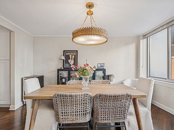 Meticulously Cared for Gold Coast Residence in a highly coveted subset north of Division and south of the park amidst significant brownstones and vintage era, pre-war buildings, one block to Lake Michigan. Boutique style high rise environment features a total of 78 units with just four units per floor, a semi private vestibule off the elevator on each floor shared between two neighbors. Residence 4B with a comprehensive and cohesive renovation completed in 2022 features a double door entrance way, real "tongue and groove" oak hardwood floors in a light walnut stain, beautiful and consistent millwork, wainscoting, crown moldings and baseboards fitting for this home throughout, solid core raised panel doors. Open kitchen concept with large square peninsula for seating and gathering, 1.25" straight edge quartz counters, abundant cabinetry accentuating a Classic Contemporary style throughout Residence 4B. White all wood cabinetry, custom linear hardware, pantry, open shelving for display/storage, abundant counter space for cook prep and food set up for the holidays, single, stainless steel under mount sink, custom sconces above, stainless steel appliances including French Door refrigerator, smooth top push in range, microwave above with micro-hood, dishwasher with incognito cabinet front. Soffitted lighting. Sumptuous living space with separate dining and living spaces. Electric fireplace in living room. Hunter Douglas window shades. Windows slide open, side to side with ease for fresh air and overlooking vintage and pre-war Gold Coast structures of architectural significance. Very quiet one way Street. Primary bedroom suite with closet built-ins, beaux primary bathroom features furniture piece vanity, custom edged Statuary marble counter, under mount ivory sink, brushed nickel plumbing fixtures, custom mirror and lighting. Oversized shower with pattered marble basin, large format floor to ceiling tiles, sliding glass door. Second bathroom also features furniture piece vanity, plenty of drawer storage, statuary marble counter, open glass shelving, tub/shower combined. In unit, washer and dryer 2 in 1 (90 minute total wash and dry cycle time) with storage shelving above. Linen closet and front hall closet. Storage cage on Mezzanine level. Additional custom details include Visual Comfort light fixtures, "Leslie" chandelier, Phillip Jeffries grass cloth wall treatment, Ashley Stark/Scala wall coverings in primary bedroom. Parking is onsite,garage valet is $305 per month and outdoor surface parking is $265 per month. Triple AAA location in the essence of the Gold Coast where walking to the world in Chicago is made easy; restaurants, nightlife, cafes, Lake Michigan, Lincoln Park at North Avenue, Oak Street Beach, finest shopping district in the city at the top of the Magnificent Mile and Oak and Rush are steps from a very classic, timeless building lobby with 24 hour doorman. Onsite property manager, engineer and maintenance staff. This smartly designed and recently FULLY renovated two bedroom and two bathroom with no expense spared will not last long. One of very few units in inventory that only require a buyer to pack their bags and move right in.
