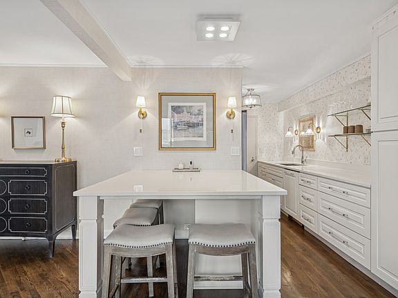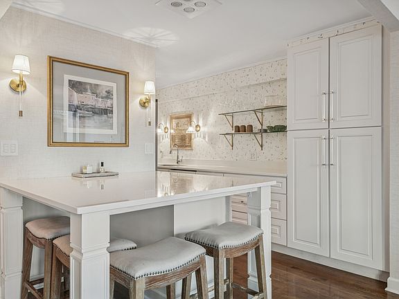 Visual comfort light fixturesBeautiful and consistent millworkHunter douglas window shadesStatuary marble counterPlenty of drawer storageAbundant cabinetryDouble door entrance way