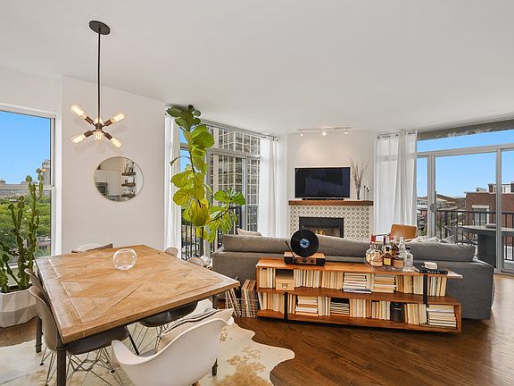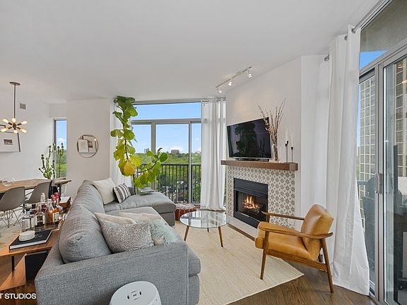 Sprawling city views and NOT on the El tracks! Enjoy the city's incredible skyline and north facing treetop views from this 2 bed/ 2 bath Northeast corner unit in prime Old Town location. Open concept living, dining and kitchen. Newer hardwood floors and beautifully updated gas fireplace. Kitchen features painted white cabinets, granite countertops, and stainless steel appliances. Private primary suite with east facing views, ample closet space and large ensuite bathroom with double sinks. Split floor plan with 2nd bed and full bathroom on the opposite side of the unit. Welcoming foyer, new window treatments, lighting fixtures and no more popcorn ceiling (removed by the sellers!). Easting facing (not on El) balcony with fantastic 180 degree city and Old Town views. Attached heated garage. Steps to El, lake, park, restaurants, shopping and so much more- A+ location!