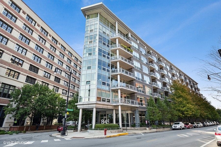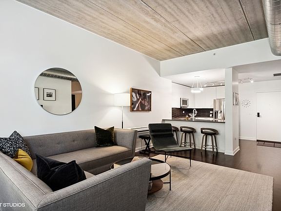 Landlords happy to renew lease at completion. This extra large 1bed+ den concrete loft, nestled in the east facing treetops of River North, has been renovated top to bottom. 9' ceilings throughout. Beautifully updated kitchen with modern white cabinetry, ss appliances, quartz countertops + garbage disposal. Kitchen peninsula creates a spacious breakfast bar. Off the large living/dining combo area is a patio with space for grilling and seating. Separating the living and private spaces is a wall of storage and washer/dryer. An ideal den/office off the living room allows for a flex space used as needed for work or guests. This den was enclosed and has a door for privacy. Nearby is a sleek spa-like bathroom Primary bedroom is a beautiful oasis with floor to ceiling windows & built in blinds, overlooking the private deck. Garage parking additional $200/month. Bike storage is optional. Full-height storage cage included. Building with 24-hr door staff, on-site full-time maintenance, package room, gym, and fob security system on all exterior doors. Located just minutes from coffee shops, cafes, the River Walk, and the Chicago brown and blue line CTA stops - this property's location makes city life easy and convenient.