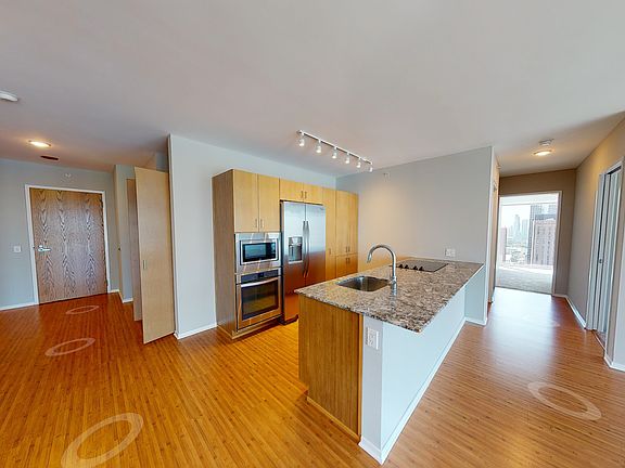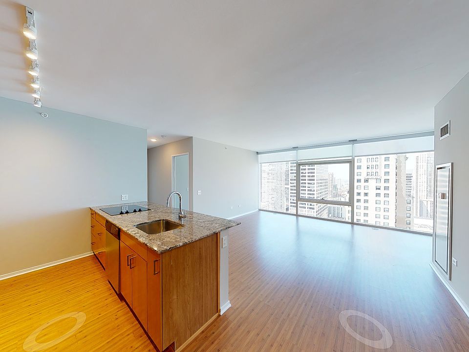 Spacious corner residence featuring a stunning primary suite with wraparound windows, offering incredible natural light and sweeping skyline and lake views. The open layout includes floor-to-ceiling windows, granite countertops, stainless steel appliances, custom cabinetry, designer lighting, hardwood-style flooring, and in-unit laundry.