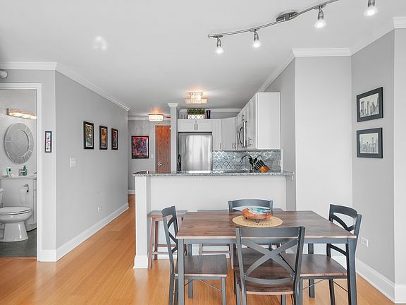 Stunning Designer Condo in the Heart of River North! This rare, remodeled 2-bedroom, 1-bath residence showcases breathtaking west and south-facing city views-including a direct sightline to the Sears Tower. Step into the beautifully updated chef's kitchen featuring stainless steel appliances, quartz countertops, and a large breakfast bar with seating. The spacious primary bedroom offers an oversized walk-in closet, while the luxurious bathroom impresses with floor-to-ceiling Porcelanosa tile, herringbone glass shower detailing, and premium designer finishes. The generously sized second bedroom comfortably fits a queen bed with two nightstands, making it ideal for guests, a home office, or a flexible multi-use space. Additional features include custom remote-controlled roller shades throughout, bose surround sound system in the living room, custom closet organizers, hardwood flooring throughout, in-unit washer and dryer. Prime deeded garage parking for $35K, and a storage unit is included. Enjoy luxury living in this full-amenity building offering 24-hour door staff, a fully equipped fitness center with stunning skyline and lake views, a newly renovated lobby, a rooftop terrace, and an updated party room with a full kitchen. Located in the heart of River North, this condo offers unbeatable walkability-steps to the CTA Red Line, bus routes, top-rated restaurants, shopping, grocery stores, coffee shops, and vibrant nightlife. Don't miss this incredible opportunity-schedule your showing today! Explore the property in 3D-click the 3D tour button for a full virtual walkthrough!