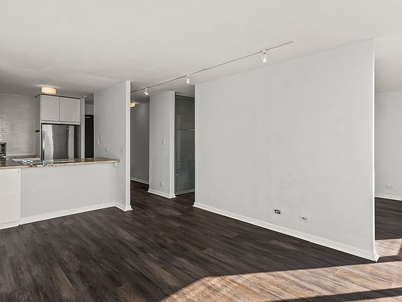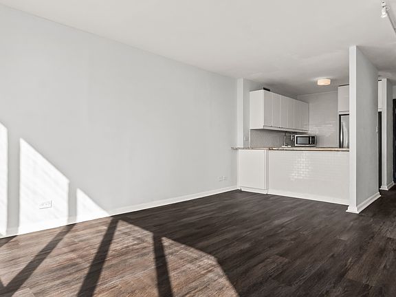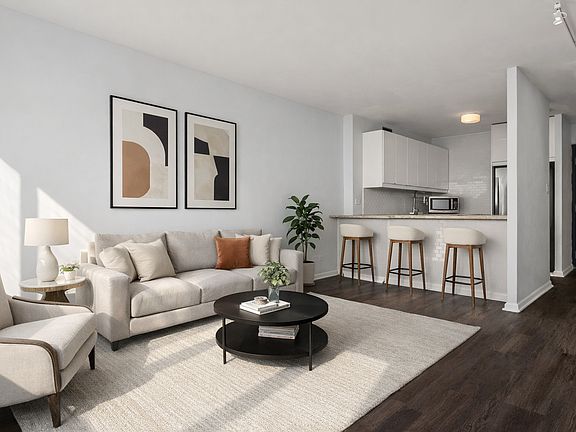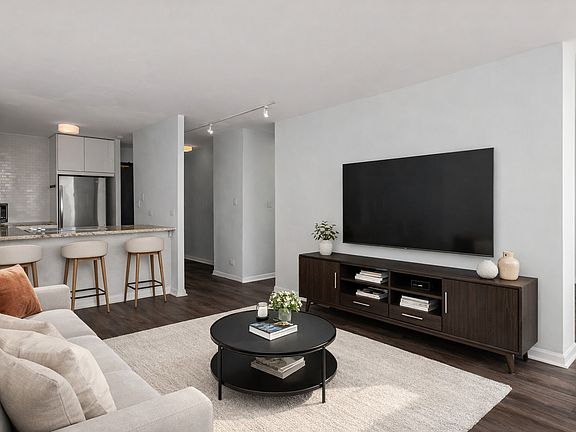 Move-in ready Junior One Bedroom, filled with natural light, this sun-drenched convertible one-bedroom offers a smart layout and excellent value. The south-facing exposure has amazing downtown views and highlights the open-concept kitchen, featuring granite countertops, white cabinetry, and a breakfast bar, ideal for everyday living and entertaining. New flooring runs throughout the unit, and the bedroom area is thoughtfully designed with nice sized closet to maximize storage and functionality. Enjoy a resort-style lifestyle in a full-amenity building offering a massive sundeck, outdoor pool, fire pits, and a modern fitness center. Recreational amenities include basketball, tennis, and pickleball courts, along with a dedicated on-site dog run. Outstanding value: Monthly assessments cover heat, A/C, cable, and high-speed internet-electricity is the only separate utility. The building features 24-hour door staff, professional management, and leased garage parking. Pet-friendly for pets up to 50 lbs.