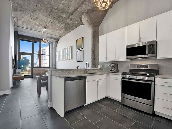 Welcome to this beautifully remodeled home in the iconic Chess Lofts with soaring 12 foot ceilings. Brand new sleek porcelain flooring elevate the entire unit, while the ideal split-bedroom layout. Facing north, this unobstructed home is filled with natural light and offers stunning city and lake views. The spacious living area easily accommodates a dining table, creating the perfect setting for everyday living and entertaining. Thoughtful upgrades include modern floating vanities, a new dishwasher, and remote control shades in every room for effortless comfort and style. This elevator building is truly hard to beat. Residents enjoy a green rooftop deck with panoramic city and lake views, a fitness center, bike room, and an onsite engineer for added convenience. Located just steps from Prairie District Park with its playground and dog park, this home offers the perfect balance of urban living and neighborhood charm.