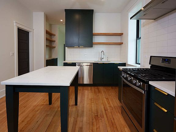 Stunning, light & bright 2 bedroom/1 bath apartment with custom, high end kitchen available now in Avondale! Best of the old and new near the Heart of Logan Square! Raised first floor. Building was fully gutted and updated in 2021, including new a new kitchen and bath. All done with attention to the vintage detail. The unit itself features a newly installed HVAC system, plumbing, electrical and roof. Nothing has been overlooked! Unit includes: central heat & air, custom cabinetry, stainless appliances, dishwasher, hardwood floors, quartz counters and custom island. Easy to use keyless entry. Rear deck. One block from restaurant row on Diversey Ave. Close to fabulous bars & restaurants and the famous Logan Square Farmer's Market. Coin laundry in lower level. Easy permit street parking & quick access to Logan Square blue line. Come live here, you will love it!