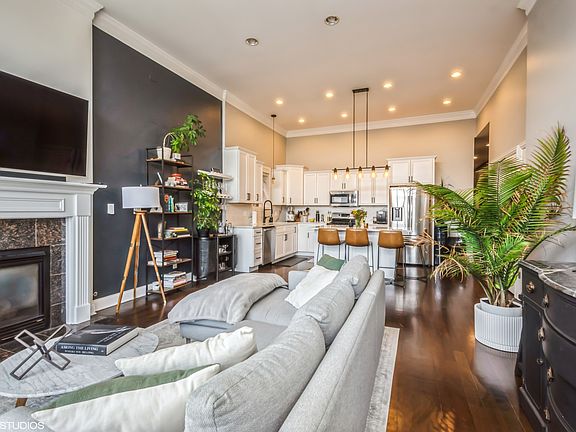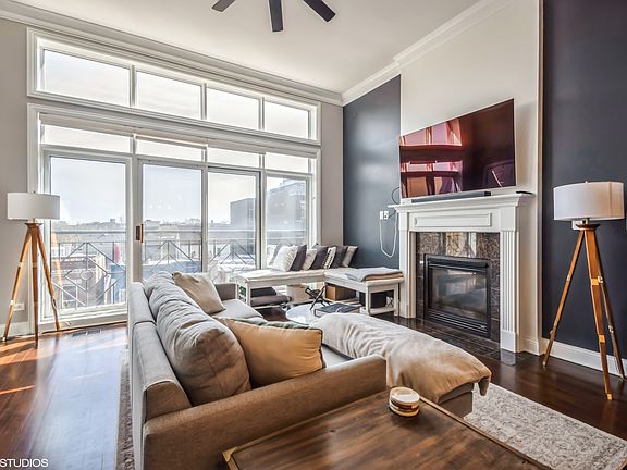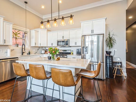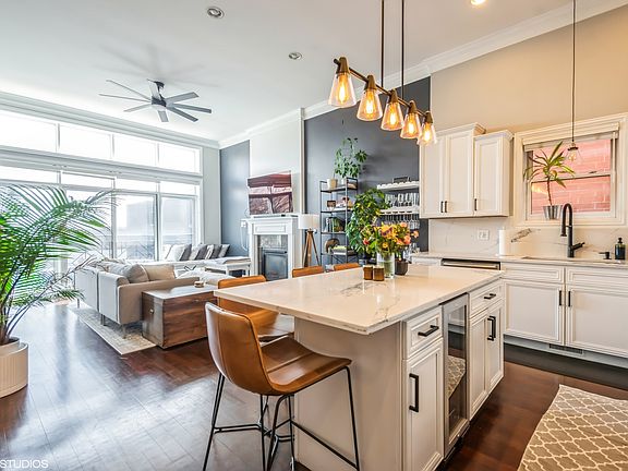 Updated Roscoe Village Penthouse featuring private rooftop deck and lofty 12-foot ceilings. Bright, airy, and sunlight drenched top floor home near Award-winning Audubon Elementary. Steps away from two shopping and dining districts with large retailers, boutiques and endless entertainment. Huge 1,700 sq ft residence featuring an open floor plan with an updated kitchen. Kitchen features quartz countertops with full height backsplash, Stainless steel appliances, and large island with wine fridge. Lounge by the fireplace in your spacious living room featuring floor to ceiling windows. Rest easy in any of three large bedrooms. Keep clean easily with two full bathrooms and adjacent in-unit washer and dryer. Primary Bedroom features walk-in closet, large ensuite bathroom with double vanity, standing steam shower, jacuzzi tub, and a walk-out balcony. Two parking spaces including one garage space for you and your guests. Entertain friends and family on your private massive rooftop deck(775 sq ft) with panoramic skyline views. Get the best of both worlds with spacious and newer construction nestled in the vibrant City.