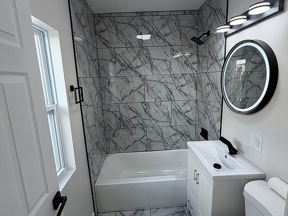 Must-see this beautifully rehabbed, spacious home! Step inside to gleaming hardwood floors that flow seamlessly through the living room, dining room, and kitchen. The stunning kitchen features quartz countertops, an island, and stainless steel appliances. The upper level offers two spacious bedrooms and a beautifully updated bathroom. The finished lower level includes an additional bedroom and a full bathroom with shower-perfect for guests or added living space. Enjoy brand-new concrete sidewalks from front to back, and a large backyard that leads to a 2-car garage. Truly move-in ready-just unpack and enjoy!