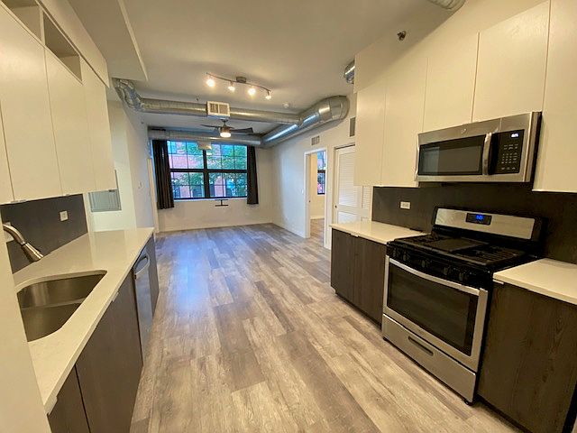 High ceilingsRooftop deck with grillsTwo-tone cabinetryUnobstructed skyline viewsKitchen with quartz countertopsExposed ductworkStainless steel appliances