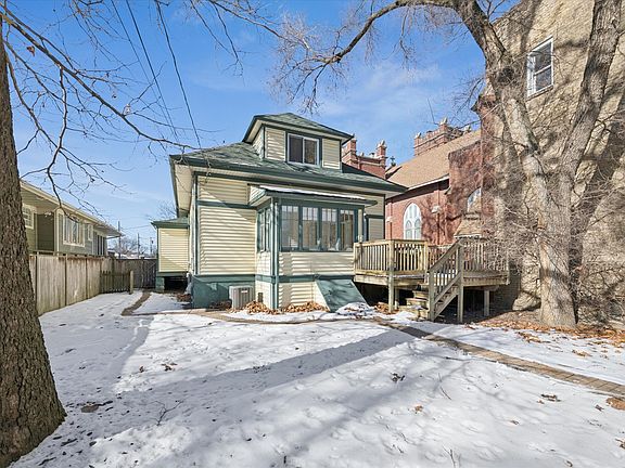 Prime value-add opportunity in sought-after Portage Park! This solid, well designed, 1912 American Four Square sits on an oversized lot and is being sold strictly "as-is" as an estate sale. Starting with the unusual large wrap around porch with solid pillars, explore the vintage charm and amazing space. Wonderful stained-glass windows in the living room, drawing room/library, and the dining room which has the original hutch and coffered ceiling. Large kitchen and pantry, one bedroom and a full bath. There are an enclosed, unheated sunporch and a deck from which you can enjoy the very large yard. Original staircase to the second floor which has 2 bedrooms and an ensuite bath. Choose to restore the woodwork, door knobs and hardware or bring your vision to convert the extra spaces upstairs into additional rooms. Updated with GFA and central air, this home was happily occupied for the last 35 years. Basement is unfinished, with laundry and mechanicals. Newer water main and meter, some copper supply lines. Two car garage.