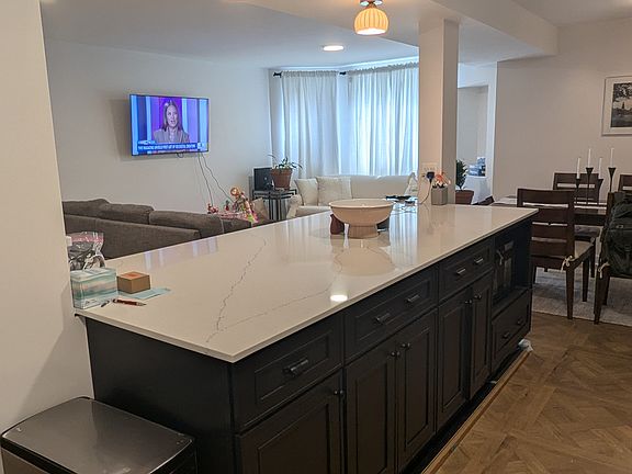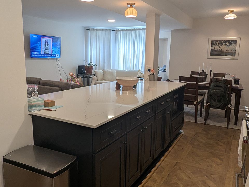Bright and spacious open-concept garden apartment featuring great natural light. The oversized kitchen offers generous counter space, with quartz countertops, and opens seamlessly to the living and dining areas, complete with a full-size coat closet.