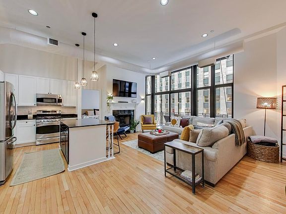 This is River North living-light, bright, and elevated. Welcome to an expansive 2-bedroom, 2-bath loft at the iconic Union Square Lofts, with effortless city energy.Oversized, sun-filled, and thoughtfully updated, this residence delivers space, style, and an unbeatable location-just steps from the Merchandise Mart, Bavette's,The Gilt Bar, and Chicago's most buzzed-about dining, shopping, and nightlife. Inside, 11-foot ceilings and walls of west-facing windows fill the home with natural light and a golden-hour glow, creating an open, airy vibe that feels both cozyand sophisticated. Hardwood floors, soft neutral tones, and a sleek gas fireplace anchor the living and dining areas, striking the perfect balance between warmthand brightness-ideal for entertaining, relaxing, or working from home. The bright white kitchen keeps things clean and modern with premium stainless-steel appliances, countertops, and ample storage-beautiful, functional, and made for real life. Both bathrooms have been stylishly updated, offering spa-inspired finishes and a calm, contemporary feel. A flexible second bedroom easily adapts as a guest suite, home office, or creative space, featuring a custom bookcase and a full bath accessible from both the bedroom and main living area. Step out to your private balcony for morning coffee, sunset moments, or a dose of River North energy. Additional highlights include in-unit laundry and oneheated garage parking space-because ease is part of the luxury. Union Square Lofts is one of River North's most desirable full-service buildings, offering 24-hour door staff, a newly renovated gated courtyard, on-site drycleaning, a receiving room, a full-time engineer, a dog run, bike storage, and more. Assessments include nearly everything except electricity, making city livingrefreshingly low-maintenance. Light-filled. Cozy. Fresh. Perfectly located.