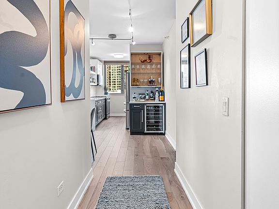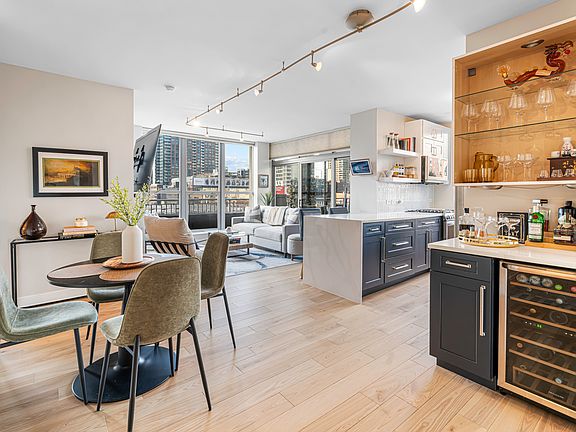 Experience elevated city living in this stunning 2 bedrooms/2-bathroom corner residence in the heart of River North. Floor-to-ceiling windows wrap the home in natural light while delivering dramatic skyline and sunset views. The open-concept living and dining areas flow seamlessly into a sleek, newly renovated kitchen featuring new cabinetry, waterfall stone countertops, a built-in wine fridge and bar, and all new stainless-steel appliances. A true standout is the expansive private terrace, fully upgraded with new electrical, lighting, TV hookup, heater (2024), and outdoor bar, creating an incredible extension of your living space for all seasons. The serene primary bedroom includes a walk-through custom closet and a spa-like bath with heated floors, dual vanities, and a walk-in shower. A split-bedroom layout provides privacy for guests or home office needs. Additional features include in-unit laundry, storage, and a deeded garage parking space. Enjoy full-service living in a well-managed building offering 24-hour door staff, fitness center, sundeck, hospitality suite, party room, dry-clean lockers, and on-site management. Monthly assessments include heat, gas, cable, and internet. All of this only steps from the Riverwalk, Ohio Street Beach, the CTA, premier shopping, dining, and nightlife.