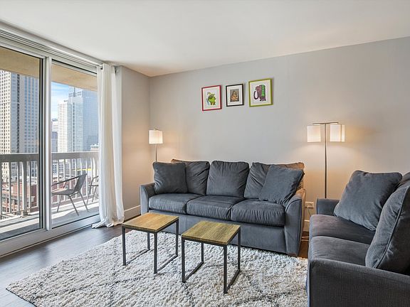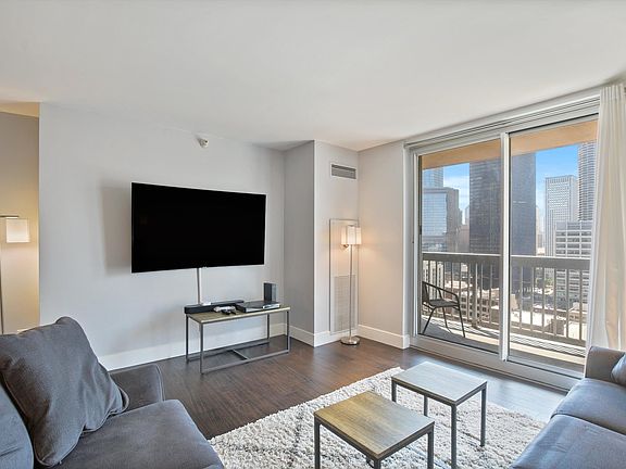 BEAUTIFUL, SOUTH FACING RENOVATED HOME WITH AMAZING CITY VIEW! THIS IS A FULLY FURNISHED RENTAL WITH BED, SOFA, TV, BARSTOOLS, COFFEE TABLE, BALCONY TABLE & CHAIRS, PILLOWS, BEDSHEETS & COMFORTER, AND OFFICE TABLE ALL INCLUDED. CUSTOM-DESIGNED 1 BD/1BA IN PERFECT RIVER NORTH LOCATION! HOME FEATURES ESPRESSO H/W FLOORS THROUGHOUT THE ENTIRE UNIT, 42" WHITE WOOD CABS, GRANITE COUNTERS, TILE BACKSPLASH, S.S. APPLIANCES, CUSTOM CALIFORNIA WALK-IN CLOSET, IN-UNIT WASHER/DRYER & LARGE BALCONY. BUILDING FEATURES: 24 HR DOORMAN, 50,000 SQFT OF AMENITY FLOOR: OUTDOOR POOL W/CABANAS, SUNDECK, RUNNING TRACK, FITNESS CENTER, BASKETBALL COURT, MEDIA ROOM, INDOOR RESISTANCE POOL, BUSINESS CNTR. WALKING DISTANCE TO EVERYTHING! RENT INCLUDES: A/C, HEAT, GAS, WATER, CABLE & INTERNET.
